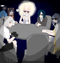 团建场似乎不定时会临时组建一个地下赌场,不少碎数研成员都会在里面鬼混休闲,某一次元洲在拿着相机进入赌场时刚好撞见一群成员缺一个人开场,留下了这张照片: