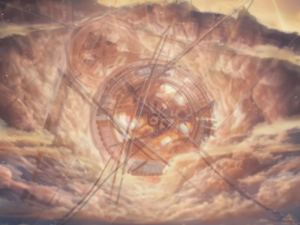 “暮色昏暗,阴云压城,忽见八巨钟悬空而行,铜色如日晦,针指三方天地人,下有波涛汹涌江水滚滚;恍然雷鸣贯耳,重云散去,竟是黎明初破晓,怎知今夕是何夕。”
